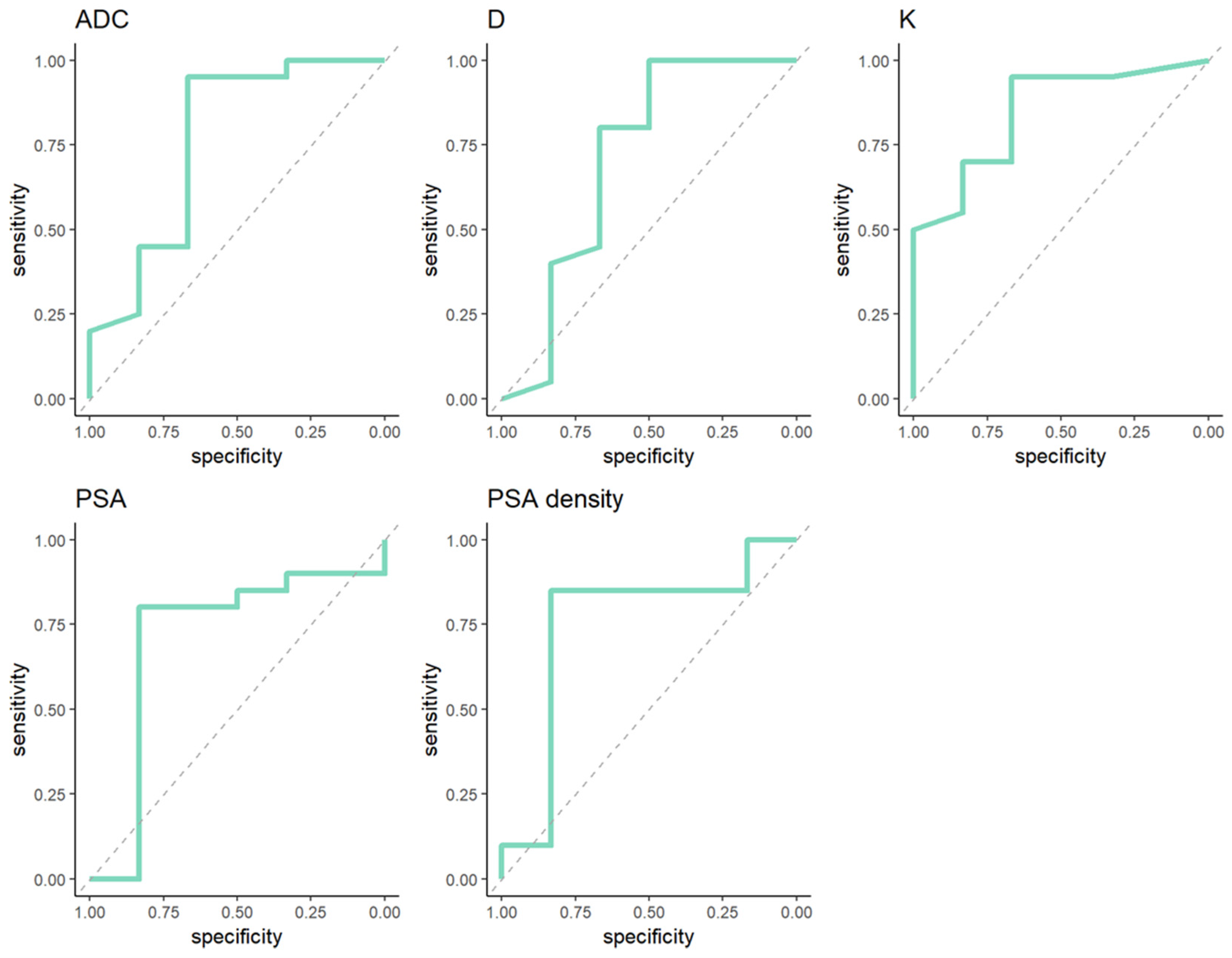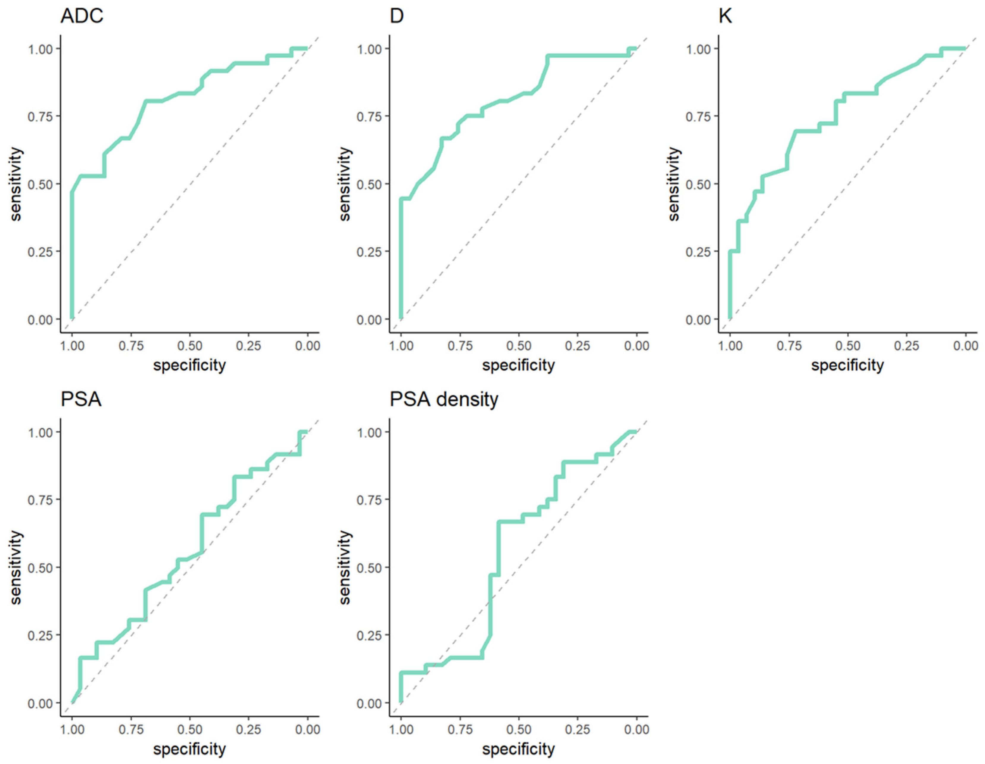 ROC analysis curves with diagnostic performance of diffusion parameters (ADC, D, K) and clinical variables (PSA, PSA density) in prediction of GG upgrade from biopsy to radical prostatectomy are demonstrated in