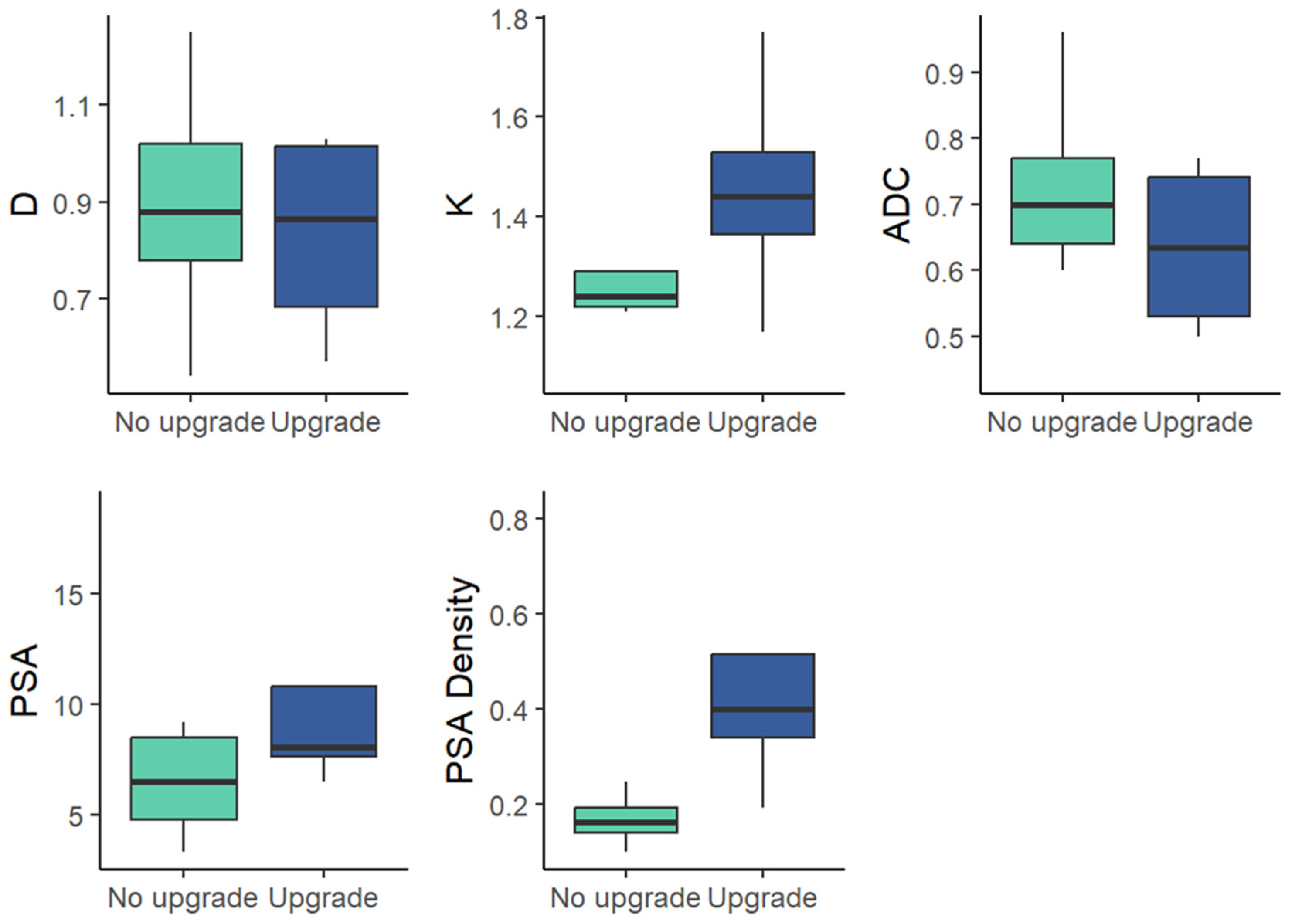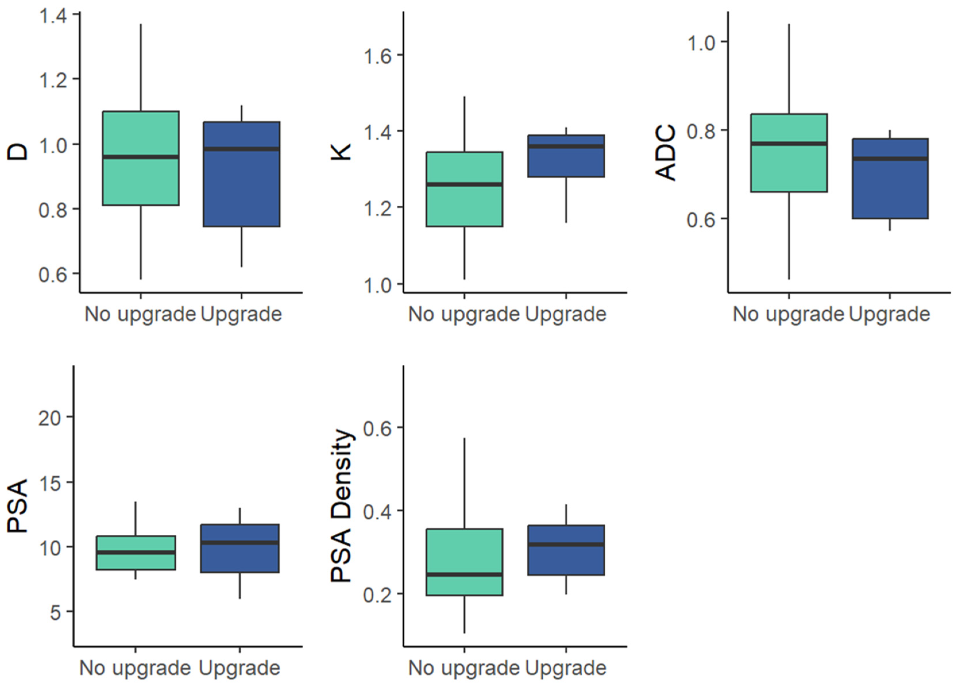 In these groups mean values of ADC, D and K in the upgraded cohort compared to cohort without an upgrade, were not statistically significant.