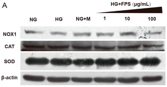 To clarify the mechanism underlying the inhibitory effect of FPS on ROS production, we detected the expression of enzymes including SOD, CAT, and Nox1 which were directly related to the formation and removal of ROS [25,26]. Compared with NG, the protein expression of SOD and CAT were reduced in HG group (p < 0.05). Moreover, the Nox1 protein level was increased in HG group (p < 0.05). As expected, FPS could suppress the expression of Nox1 at different concentrations (p < 0.05 or p < 0.01) and, simultaneously, FPS upregulated CAT and SOD protein expression (p < 0.05 or p < 0.01) (Figure 8).