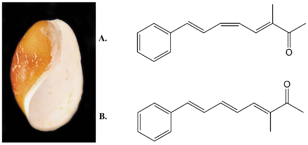 - Cimino, G.; Spinella, A.; Sodano, G. Potential alarm pheromones from the mediterranean opisthobranch Scaphander lignarius. Tetrahedron Lett. 1989, 30, 5003–5004. [Google Scholar] [CrossRef]