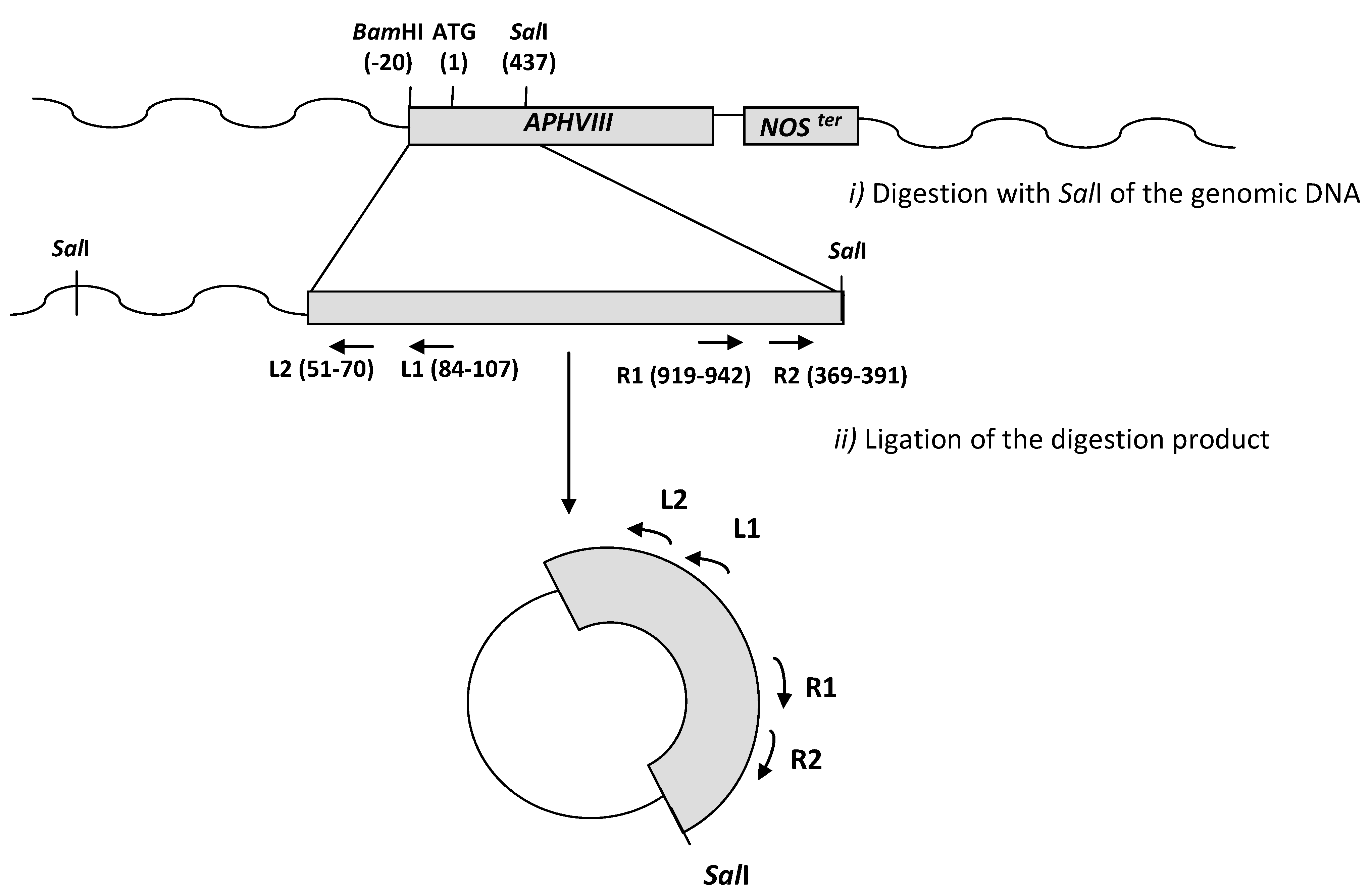 Scheme of the inverse PCR strategy used for amplification of the regions preceding the APHVIII marker insertion. The approximate sites for primers hybridation and restriction enzymes digestion are indicated.