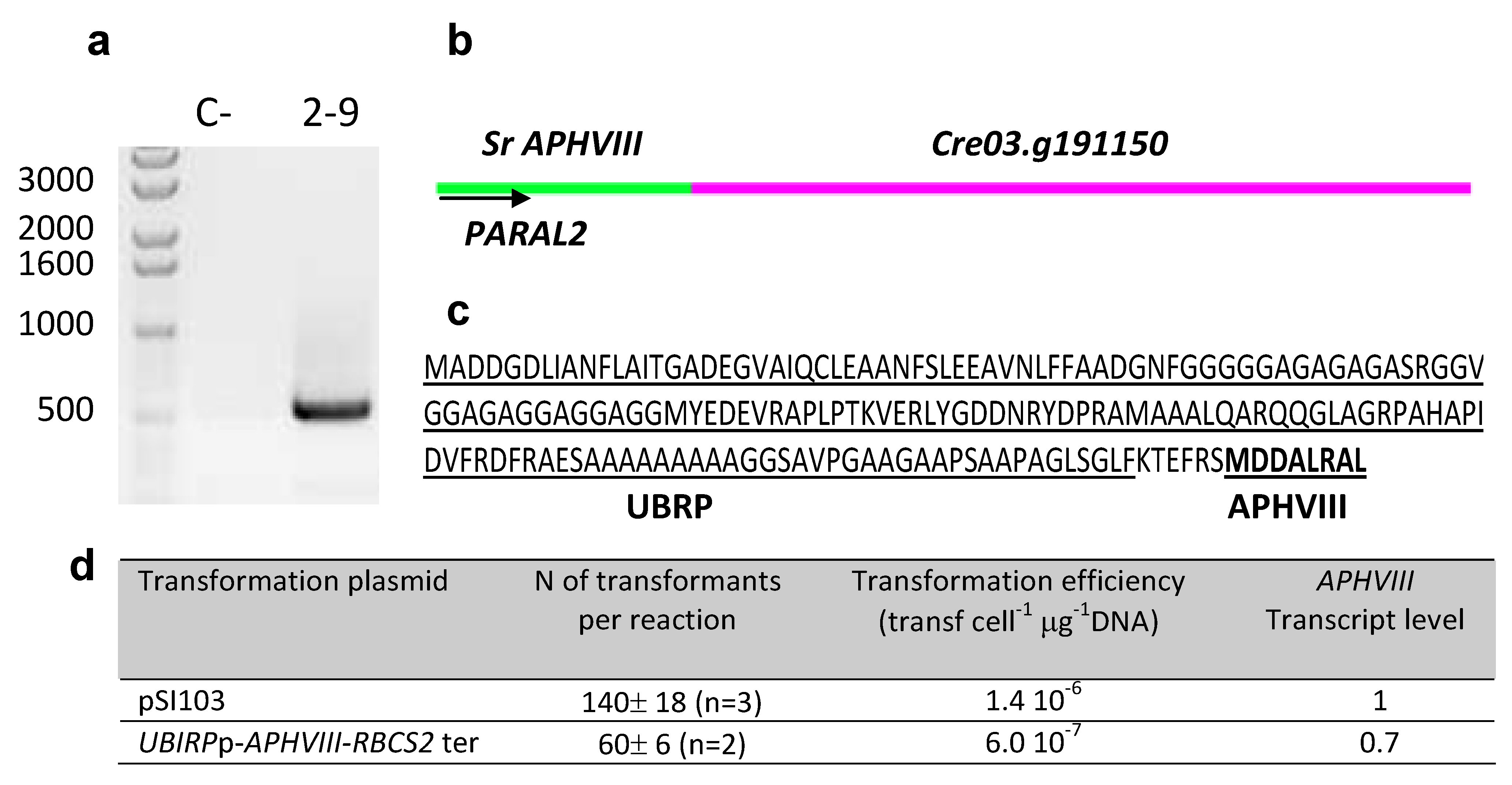 Detailed molecular characterization of transformant 2–9. The genomic DNA fragment amplified during the second round of the iPCR preformed in 2–9 transformant was separated by agarose gel electrophoresis (a). The product was sequenced and analyzed using the BLAST tools of the NCBI and the Chlamydomonas genome data (b). The amino acid sequence translated from the amplified sequence shows that the predicted UBIRP and APHVIII proteins are in the same reading frame (c). The efficiency of the nuclear transformations and the relative fold difference between the APHVIII transcript level in transformants of Chlamydomonas reinhardtii obtained with UBIRP-APHVIII and with pSI103 plasmid (d) are also shown.
