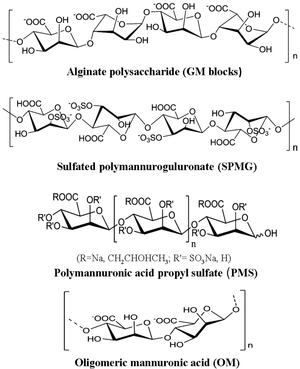 Alginates are the major constituent of brown seaweeds’ cell walls and are linear acidic polysaccharides composed with a central backbone of poly-D-glucuronic acid (G blocks), poly-D-mannuronic acid (M blocks) and alternate residues of D-guluronic acid and D-mannuronic acid (GM blocks) [20]. Fucans are also one of the major constituents of brown seaweed cell walls, and are ramified sulfated polysaccharides constituted by a central backbone of fucose sulfated in positions C2 and/or C4 and ramifications at each two or three fucose residues [21].