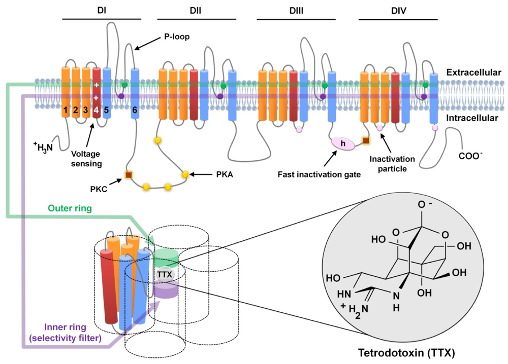 Schematic representation of voltage-gated sodium channel α-subunits and Tetrodotoxin (TTX) binding site. Voltage-gated sodium channel α-subunits are formed by four homologous domains (DI-IV), each consisting of 6 α-helical transmembrane segments (1–6). Segment 4 (dark red) corresponds to the voltage sensors. Sites of phosphorylation by protein kinase A (PKA) and protein kinase C (PKC) are represented by yellow circles and brown squares, respectively. The fast inactivation gate (IFM motif) is located in the intracellular loop between domains 3 and 4 and is represented by h (in pink oval); pink circles show the sites involved in forming the inactivation gate receptor. P-loops are located between helices 5 and 6 (in blue), which are the pore-lining segments (as shown in the lower figure). Outer (EEDD motif) and inner (DEKA motif) rings, represented by a green and purple band, respectively (in both the upper and lower figures), are formed by the amino acids indicated by circles of the same color. The TTX molecule interacts with the amino acid residues of these two rings in the pore of the channel, as detailed in the lower figure.
