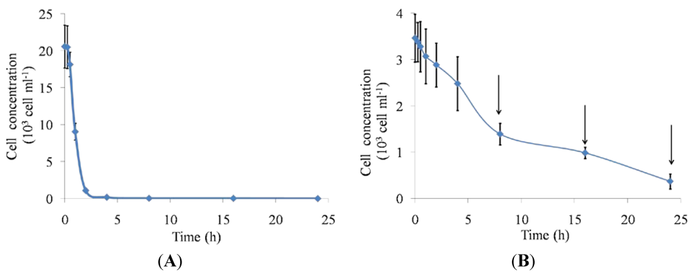 Depletion by juvenile Pacific calico scallops Argopecten ventricosus (shell height = 4.16 cm ± 1.1 cm) over 24 h of (A) Isochrysis galbana control cells and (B) toxic Gymnodinium catenatum cells. G. catenatum cells were given once at a concentration of 3500 cells mL−1 and I. galbana were given once at a concentration of 25 × 103 cells mL−1 in a final volume of 1.5 L. Data are mean ± SD (control n = 48; treated n = 48). Arrows indicate production of pseudofeces.