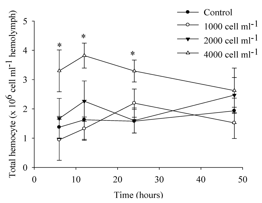 Hemocyte counts over 48 h in juvenile Pacific calico scallops Argopecten ventricosus (shell height = 4.98 cm ± 0.7 cm) fed different concentrations of Gymnodinium catenatum under controlled conditions. Hemolymph was withdrawn and counted at 6, 12, 24, and 48 h. At the highest concentration of toxic alga cells, some scallops were paralyzed. Paralyzed and non-paralyzed scallops were tested. Data represent mean ± SD (control n = 10; treated n = 10). Asterisk indicates statistically significant differences between the control and treated groups (P < 0. 05).