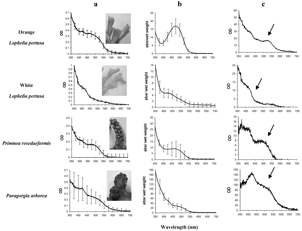 White L. pertusa showed similar in vitro absorbance maxima as orange L. pertusa, although at shorter wavelengths (Figure 1b). Living specimens of orange L. pertusa had a broad absorption maximum from 400 to 550 nm that was not present in white L. pertusa. All species had an absorbance maximum at 420 nm.