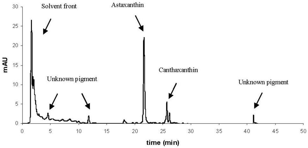 HPLC work was performed using a Hewlett-Packard 1100 series HPLC system equipped with a diode array optical density detector (350–800 nm) for pigment isolation, identification and quantification according to Rodriguez et al. (2006) []. Synthetic standards of Astaxanthin (Fluka number 32993) and Canthaxanthin (Fluka number 41659) were applied as references.