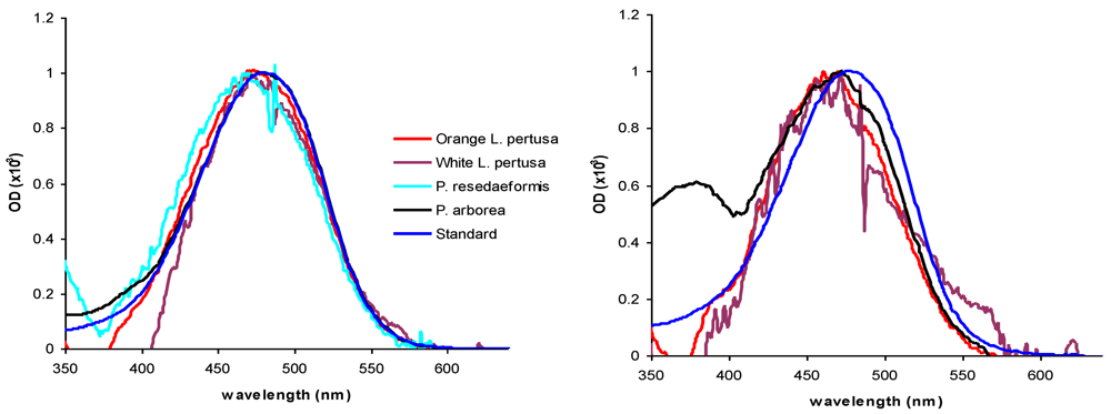 In vitro absorption (a(λ) g−1 wet weight) spectra of acetone raw pigment extract demonstrated a distinct peak in orange L. pertusa (Figure 1b) with a(λmax) at 480 nm. Absorption spectra for white L. pertusa, P. arborea and P. resedaeformis did not show as distinct peaks, however they showed slightly different signatures compared to the in vivo absorbance curves (Figure 1a).