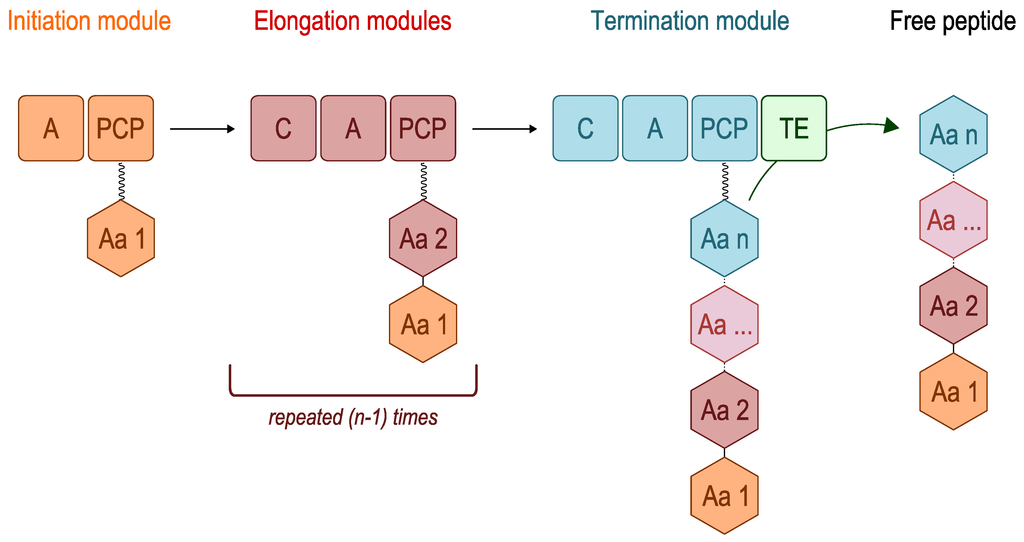 NRPSs are multimodular enzymes. Each module is divided into domains. Three domains are required for synthesis of the peptide backbone: The adenylation (A) domain, the peptidyl carrier protein (PCP) and the condensation (C) domains [17]. NRPSs have already been presented and discussed in other reviews [13,17,18,19,20].