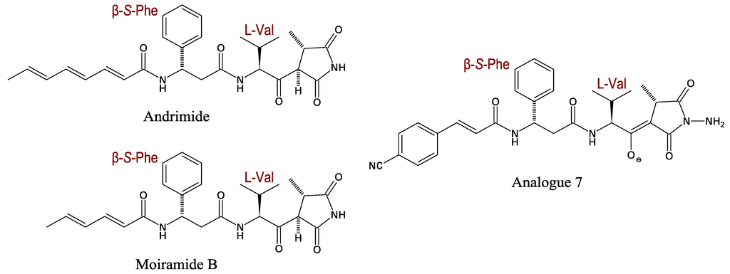 Andrimid consists of four components: (1) An unsaturated fatty-acid chain; (2) A β-Phe moiety; (3) A l-Val derived β-ketoamide moiety and (4) A pyrrolidinedione. Andrimid and moiramide differ only in the length of their fatty acid chains. A broad antibacterial spectrum has been described for andrimid with activity towards Gram-positive and -negative bacteria [42]. The broad antibacterial activity is likely linked to the molecular target of these compounds, i.e., the widely conserved acetyl-CoA carboxylase (ACC) [45].