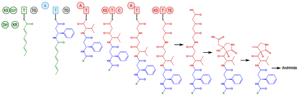The putative hybrid NRPS-PKS system involved in andrimid synthesis is a good example for studying the hybrid mechanism of synthesis because the enzyme is relatively small (less than 100 kDa [48]). The gene cluster comprises four recognisable sections that play distinct roles: (1) Formation of a polyunsaturated fatty acid by an iterative type II PKS; (2) Formation and insertion of β-Phe; (3) Construction of a succinimide precursor from Val, Gly, and C2 units from two equivalents of malonyl-CoA; and (4) Resistance and enzyme priming (Figure 3) [43,49].