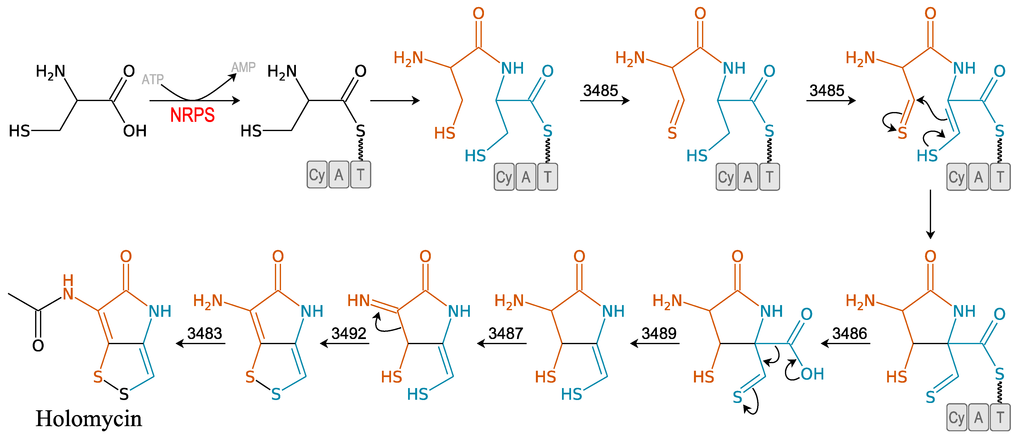 Recently described, holomycin is produced by the Photobacterium halotolerans S2753 [41]. It is the final product of a Cys-Cys dipeptide precursor that displays a broad spectrum of antibacterial activity [31]. This pyrrothine compound is an excellent example of how natural amino acid residues can be modified to form “exotic” molecules (Figure 5). Prior to this study, this pyrrothine antibiotic compound had only been isolated from Gram-positive bacteria and especially from the actinomycete Streptomyces clavuligerus [53]. Holomycin exerts a bacteriostatic effect on both Gram-negative and -positive bacteria species [54]. It causes rapid inhibition of RNA chain elongation [54,55]. The gene cluster responsible for its synthesis in S. clavuligerus is a one-module NRPS system (Figure 5) [31].