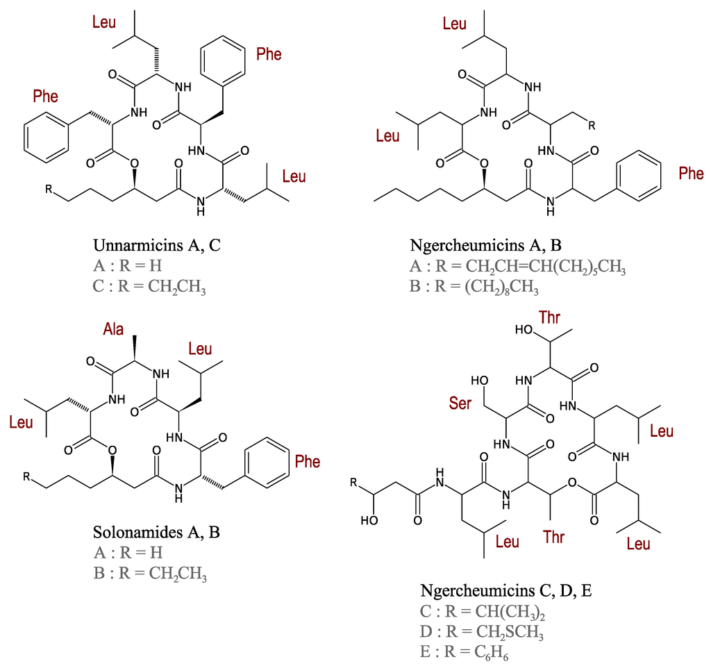 Unnarmicins are depsipeptides isolated from the fermentation broth of a marine Photobacterium sp. MBIC06485. Unnarmicins contain two Leu, two Phe, and one 3-hydroxyoctanoyl moiety or one 3-hydroxyhexanoyl group in unnarmicins A and C, respectively (Figure 6). These compounds exert an antibacterial activity only towards species of the Pseudovibrio genus, one of the most common α-Proteobacteria genera in the marine environment [58].