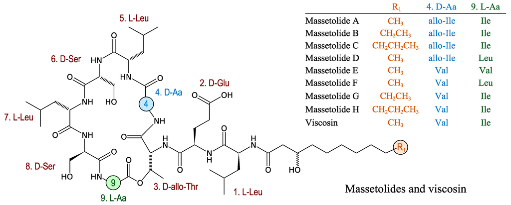 - De Bruijn, I.; de Kock, M.J.D.; de Waard, P.; van Beek, T.A.; Raaijmakers, J.M. Massetolide A biosynthesis in Pseudomonas fluorescens. J. Bacteriol. 2008, 190, 2777–2789. [Google Scholar] [CrossRef]