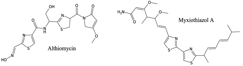 - Trowitzsch, W.; Reifenstahl, G.; Wray, V.; Gerth, K. Myxothiazol, an antibiotic from Myxococcus fulvus (Myxobacterales). II. Structure elucidation. J. Antibiot. 1980, 33, 1480–1490. [Google Scholar] [CrossRef]