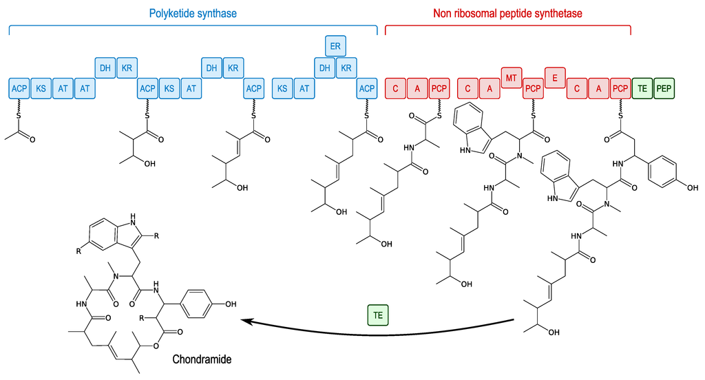 - Rachid, S.; Krug, D.; Kunze, B.; Kochems, I.; Scharfe, M.; Zabriskie, T.M.; Blöcker, H.; Müller, R. Molecular and biochemical studies of chondramide formation-highly cytotoxic natural products from Chondromyces crocatus Cm c5. Chem. Biol. 2006, 13, 667–681. [Google Scholar] [CrossRef]