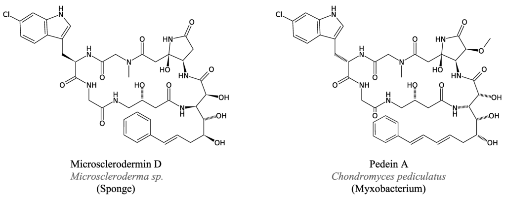 - Bewley, C.A.; Debitus, C.; Faulkner, D.J. Microsclerodermins A and B antifungal cyclic peptides from the lithistid sponge Microscleroderma sp. J. Am. Chem. Soc. 1994, 116, 7631–7636. [Google Scholar] [CrossRef]