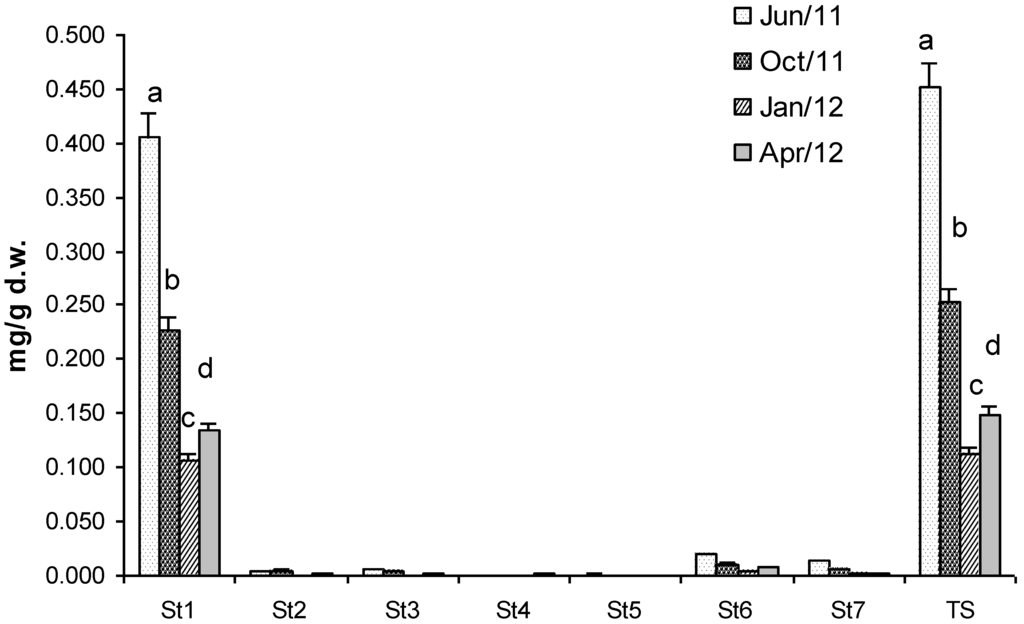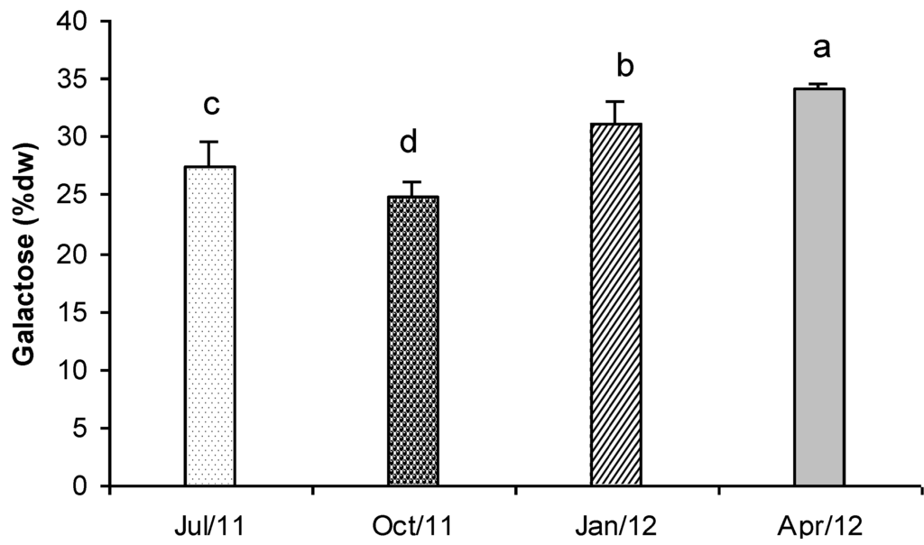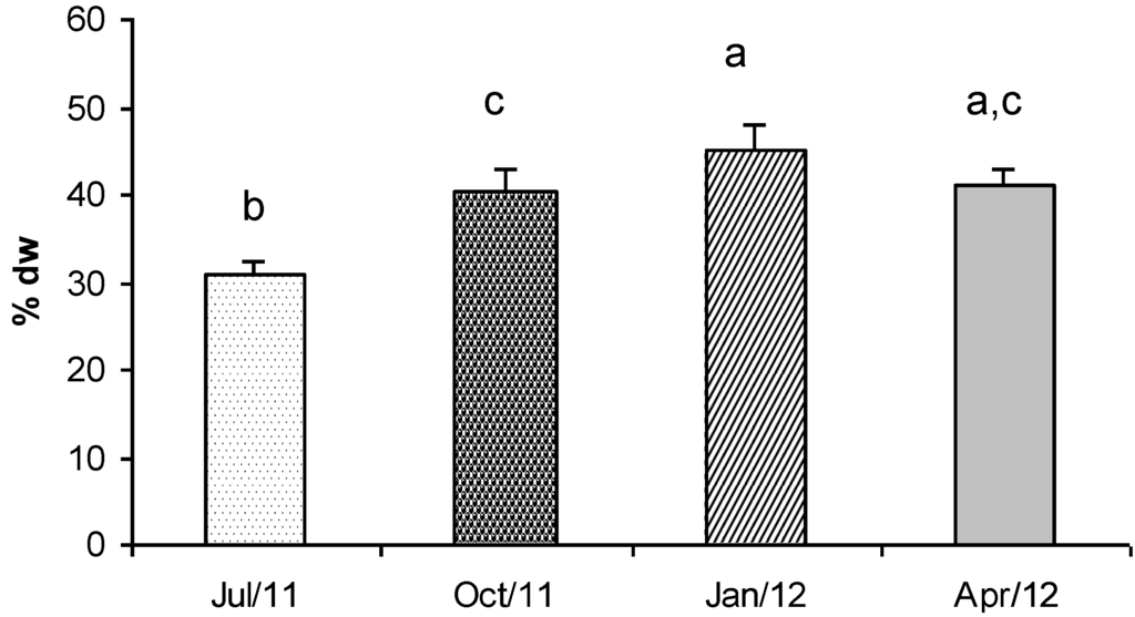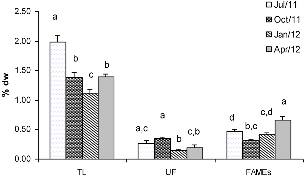The unsaponified fraction of total lipids, which includes waxes, sterols, fat-soluble vitamins and carotenoids, generally was low and ranged between 0.35% dry weight in October and 0.15% dry weight in January (Figure 1). In this case Tukey’s test showed significant differences only in the samples collected in autumn and winter (Figure 1).