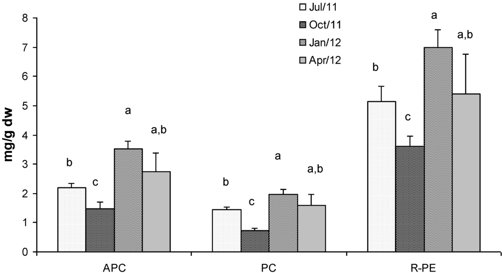 Statistical analyses showed significant differences in terms of phycobiliprotein concentration in all the seasons, except for samples collected in April when the concentrations were significantly different only with respect to the values detected in October (Figure 4).