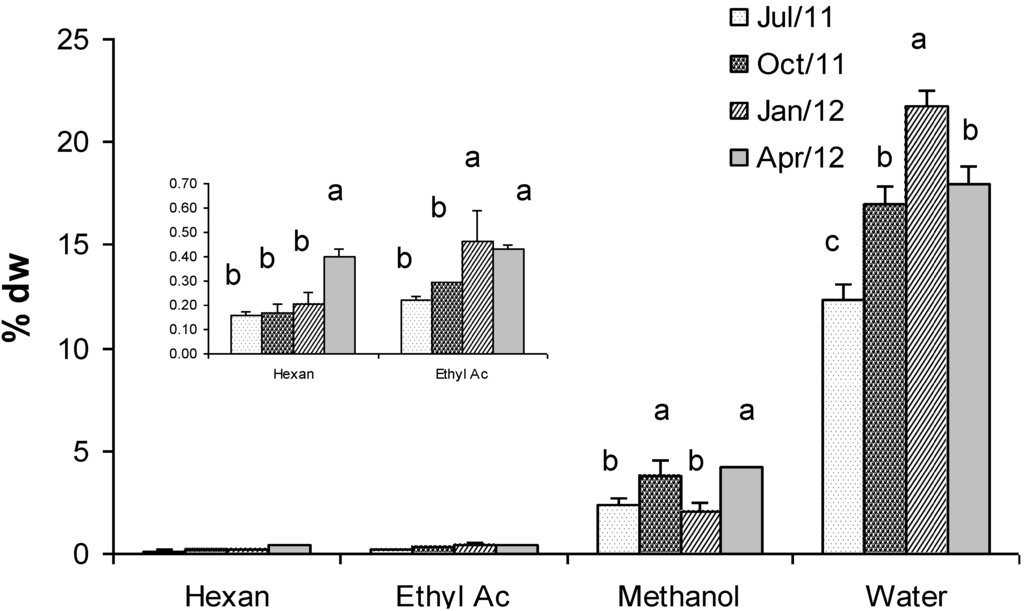Figure 5 shows concentrations of Gracilaria extracts obtained by using four solvents with increasing polarity: n-hexane, ethyl acetate, methanol and water (at 80 °C). Results evidenced that the higher the solvent polarity the higher the concentration of extract. Therefore, the highest concentration was found using water (21% dry weight), whereas the lowest one was found using n-hexane (0.16% d.w.). Statistically significant differences were detected mainly in the water extracts during all the seasons, except in April when values were comparable with those observed in October (Figure 5). Methanol and ethyl acetate showed intermediate concentrations (4.2% and 0.43% dry weight in April respectively). Generally, extracts of biomass in winter were more concentrated than extracts of biomass in other seasons. Exceptions were represented by the n-hexane and methanol extracts that showed the highest concentration in April (0.40% dry weight). Interestingly, in the same sample the highest concentrations of FAMEs were also found, which might have been extracted by n-hexane.