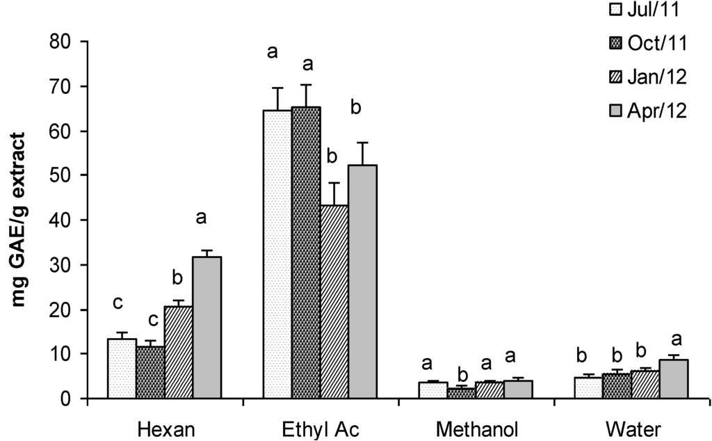 The four seasonal extracts showed a high variability in antioxidant activity (as µmol Trolox g−1 extract) (Table 2). Analysing the biomass sampled in July, the highest activity (809 µmol Trolox g−1) was found in the ethyl acetate extract. The n-hexane extract showed an intermediate value (370 µmol Trolox g−1) whereas in the methanol and water fraction the lowest antioxidant activities were found (100 and 13 µmol Trolox g−1, respectively). Interestingly, these values decreased to about 60%–70% in extracts of biomass sampled in October. In fact, the antioxidant activity was 312 µmol Trolox g−1 in the ethyl acetate extract, 114 µmol Trolox g−1 in hexane, 27 µmol Trolox g−1 in methanol and 9 µmol Trolox g−1 in the water extract.