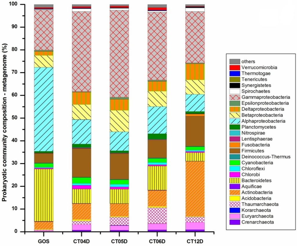 Progress in next-generation sequencing is fueling a rapid increase in the number and scope of microbial community-targeted studies [,,,,,]. While metagenomics provides information on the taxonomic composition and metabolic potential of a microbial community, metatranscriptomics serves to unveil the actual metabolic activities of the community at a specific time and place, and how those activities change in response to environmental forces or biotic interactions []. Defining the relationship between microbial community composition and function (metabolic characteristics) has been a major challenge in studying heterotrophic carbon cycling in marine systems []. The combination of metagenomic and metatranscriptomic approaches has proven efficacious in deciphering the phylogenetic composition, metabolic potential and pathways of deep-sea microbial communities. For example, in a recent study, coupled metagenomic and metatranscriptomic analyses were utilized for taxonomic and functional characterization of marine microbial communities living at depths between 25 and 500 m []. The results provided novel insight into not only microbial diversity but also specific metabolic processes transpiring in the ecosystems. Moreover, the different relative abundance of taxonomic groups identified in the metagenomic and metatranscriptomic libraries arising from the study revealed differential relative transcriptional activities per cell [].