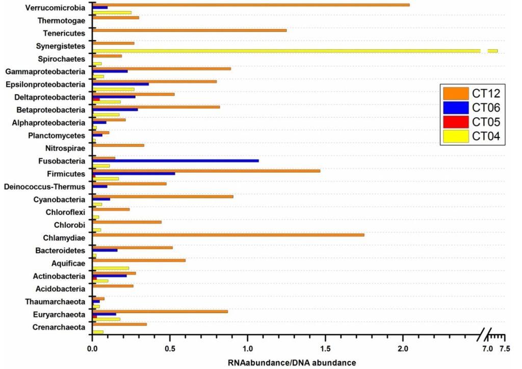 From the metagenomic analysis, a total of 453, 462, 598 and 564 different prokaryotic genera were identified for site CT04, CT05, CT06 and CT12, respectively; while from the metatranscriptome analysis, the numbers of detected genera were 113, 34, 138 and 332. The number of species identified and overall community diversity revealed by metatranscriptomic data was relatively low compared to the metagenomic data. Metagenomic analysis provides better coverage of microbial species but lacks the information afforded by metatranscriptomic analysis on the metabolic activities of the communities described. Given the differences observed between metagenomic and metatranscriptomic analysis, it is clear that neither metagenome-based nor metatranscriptome-based analysis is sufficiently comprehensive to fully characterize a microbial community. In this study we defined a parameter to measure the strength of metabolic activity at the genus level as the ratio of transcript abundance in the RNA pool to gene abundance in the DNA pool. The abundances calculated and provided by MG-RAST are counts of taxon (the abundance represents the number of times a particular taxon is detected) or function (each count represents the number of times a particular functional role is detected) []. Prokaryotic genus with very low abundance values (as low as 1), or lack of either DNA or RNA data, was excluded from the analysis. Figure 3 shows the RNA/DNA ratio of the major prokaryotic classes identified in the deep-sea samples. We found that the RNA/DNA ratio of single phylum/sub-phylum varied considerably among the deep-sea sites, likely reflective of the different metabolic conditions the prokaryotic communities were experiencing in the varied environments (Figure 3). Overall, the prokaryotic community in site CT12 (20.0 km away from a hydrothermal vent on the Juan de Fuca Ridge []) showed the highest RNA/DNA ratios among the four sites for almost all detected phyla except Synergistetes, consistent with the relatively higher temperature and mineral-rich environment which support highly diverse and more active communities of microbes around hydrothermal vents [,]. Due to the small taxonomic coverage from the RNA pool, RNA/DNA ratios were missing for most of these phyla in CT05, except for phyla Euryarchaeota, Thaumarchaeota, Actionbacteria, Firmicutes and Proteobacteria.