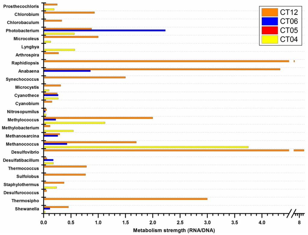 Metabolic activity strength comparison using RNA/DNA ratios of selected prokaryotic genera.