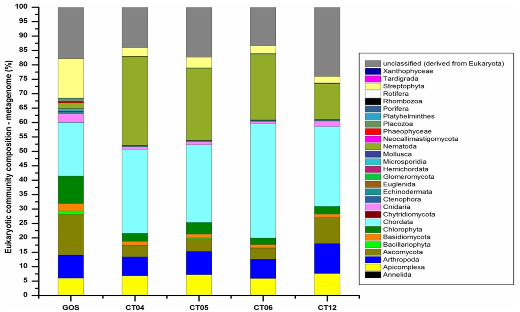 In line with our observations regarding the deep-sea prokaryotes, deep-sea eukaryotic communities displayed remarkably different compositions from those in the GOS surface water (Figure 6). Though eukaryotes accounted for a far higher proportion in the sampled deep-sea microbial communities (58.73%–71.92% in metagenomic data) than in the GOS surface water (3.31% in metagenomic data) [], the diversity of the deep-sea eukaryotic community was very limited: In the GOS surface water, 25 different eukaryotic phyla were identified, while 17, 17, 18 and 20 eukaryotic phyla were identified at the deep-sea sampling sites CT04, CT05, CT06 and CT12, respectively. In contrast, fungi Chytridiomycota, flagellate Euglenida, parasite Rhombozoa, animal Tardigrada, and yellow-green algae Xanthophyceae were absent in all four deep-sea sites. Besides, the community changes from the GOS surface water to the deep-sea water were primarily manifest in the emergence of phyla Chordata and Nematoda, and the decrease of fungi Ascomycota, Basidiomycota, green algae Chlorophyta, plant Streptophyta and Cnidaria. Fungus Chytridiomycota, Glomeromycota, Microsporidia, Neocallimastigomycota, algae Phaeophyceae, Xanthophyceae, diatom Bacillariophyta and other animal phyla were also identified in the deep-sea metagenomic data, although making up only a small proportion of the total. Because we studied the microbial diversity using non-size-fractionated deep-sea samples, animalia Chordata and Nematode, whose sizes are typically around 2.50 mm, turned out to be dominant groups here. The proportion and diversity of fungi was also found to be decreased in the deep-sea water. In the GOS surface water, 100 fungus species were identified; while in the deep-sea water 63, 66, 68 and 75 different fungus species were identified in sites CT04, CT05, CT06 and CT12, respectively. The decrease in fungus was also reported in a previous study which reported that, compared to surface water, fungi were rare and less diverse in high-pressure, deep-sea environments []. Our results also identified three phyla belonging to eukaryotic parasites, including Apicomplexa, Annelida and Nematode. Apicomplexa were commonly found in deep-sea environments including hydrothermal vents [] and methane cold seeps []. Annelida, which we identified with very small abundance in site CT12, is one of the few parasites found in hydrothermal vents []. Another detected eukaryotic parasite, Nematodes, is among the most abundant metazoan taxa in deep-sea ecosystems in general [,,].