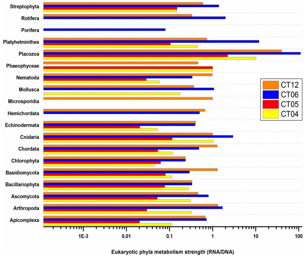 Searching against the COG database, we found a similar trend in functional categories for deep-sea eukaryotes and prokaryotes in the metagenomic libraries (Figure 7). In contrast to GOS surface water, deep-sea eukaryotic protein coding genes are more involved in functions such as “defense mechanisms”, “intracellular trafficking, secretion, and vesicular transport”, “signal transduction mechanisms”, “replication, recombination and repair” and “inorganic ion transport and metabolism”, which are useful for leading a defensive life style as discussed in the section on prokaryotes. For deep-sea eukaryotic communities relatively limited COG clusters were identified in the metatranscriptomic libraries compared to the metagenomic libraries. The transcriptional activity of protein-coding genes varied remarkably among the four sampling sites, and it was difficult to identify any obvious trends analogous to those identified in the metagenomic libraries (Figure 8). Of the 23 functional categories identified in the metagenomic libraries, 17 categories in CT04, 8 in CT05, 15 in CT06 and 20 categories in CT12 were identified in their metatranscriptomic pool: better coverage compared to the prokaryotic metatranscriptomic libraries, possibly due to the larger number of sequencing reads obtained (Table 5). Among the four deep-sea metatranscriptomic libraries, site CT12 showed the highest percentage of genes related to the functional category “inorganic ion transport and metabolism”. This category from CT12 was mainly enriched with clusters including “Outer membrane receptor proteins, mostly Fe transport” COG0629, “Predicted divalent heavy-metal cations transporter” COG0428, and “Cation transport ATPase” COG0474. For the categories “signal transduction mechanisms” and “replication, recombination and repair”, site CT12 also harbored a significantly higher percentage of genes than other three sites. “Diadenosine tetraphosphatase and related serine/threonine protein phosphatases” COG0639 and “Universal stress protein UspA and related nucleotide-binding proteins” COG0589 are two main components included in this category. Site CT05 showed discernibly lower metabolic strength in most eukaryotic phyla, while CT06, very close and at similar depth to CT05, showed the highest metabolic strength in almost all eukaryotic phyla, similar to our findings in the deep-sea prokaryotic study.