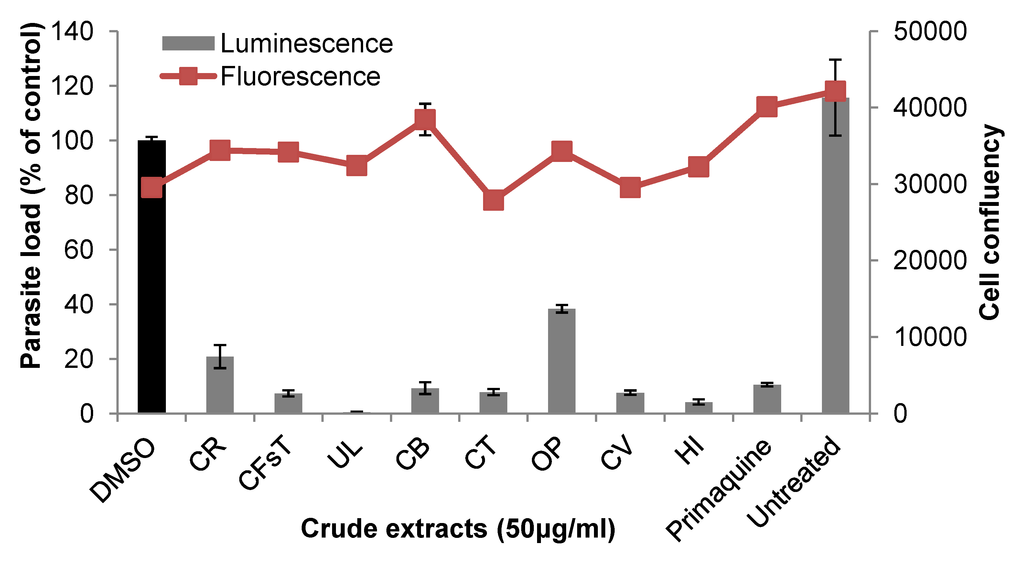 Three hours after infection, the seaweed extracts were diluted in complete culture medium to a final concentration of 50 μg/mL and added to infected cells for over 40 h with medium/crude extracts changes 24 h after infection. Dimethysulfoxide (DMSO, Sigma-Aldrich, Munich, Germany), at a final concentration of 1.15% was used as a negative control. Primaquine biphosphate (Sigma Aldrich, Munich, Germany) was the positive control. Antiplasmodial activity of seaweed crude extracts was assayed according to ref. []. Briefly, at the end of treatments, cells were rinsed twice with PBS and further incubated in 75 μL of 1× reconstituted firefly luciferase lysis buffer per well, with agitation for 15–20 min at 400 rpm at rt. The plate was centrifuged at 1000 rpm for 5 min in order to pellet cellular debris. Thirty μL of lysate from each well was transferred into a well in a white 96 well plate (Corning Incorporated, Corning, NY, USA), followed by the addition of 50 μL of 0.2 mg/mL of d-luciferin. The plate was agitated for 4 s and luminescence intensity was measured in a microplate plate reader (Infinite M200, Tecan, Group Ltd., Männedorf, Switzerland) for 100 ms at excitation and emission wavelengths of 530 nm and 590 nm respectively. The level of luciferase activity in drug-treated samples was expressed as a percentage of control. All measurements were run in triplicates.