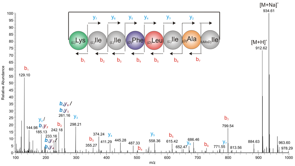 In order to obtain the primary sequence of the peptide, HR-ESI-(+)-Orbitrap-In-Source-fragmentation (SID) spectra (Figure 5) were measured, which yielded preferably the y- and b-ion fragments according to the Roepstorff nomenclature for peptide fragmentation [11]. In combination with the results from the amino acid analysis (Figure 4) the primary sequence of the peptide could be established as: [(L)Lys1-(x)Xle2-(x)Xle3-(D)Phe4-(x)Xle5-(x)Xle6-(D)Ala7-(x)Xle8] with x = d, l, or Allod leaving the identity and the stereochemistry of five amino acids of the Leu/Ile-(Xle)-type undetermined.