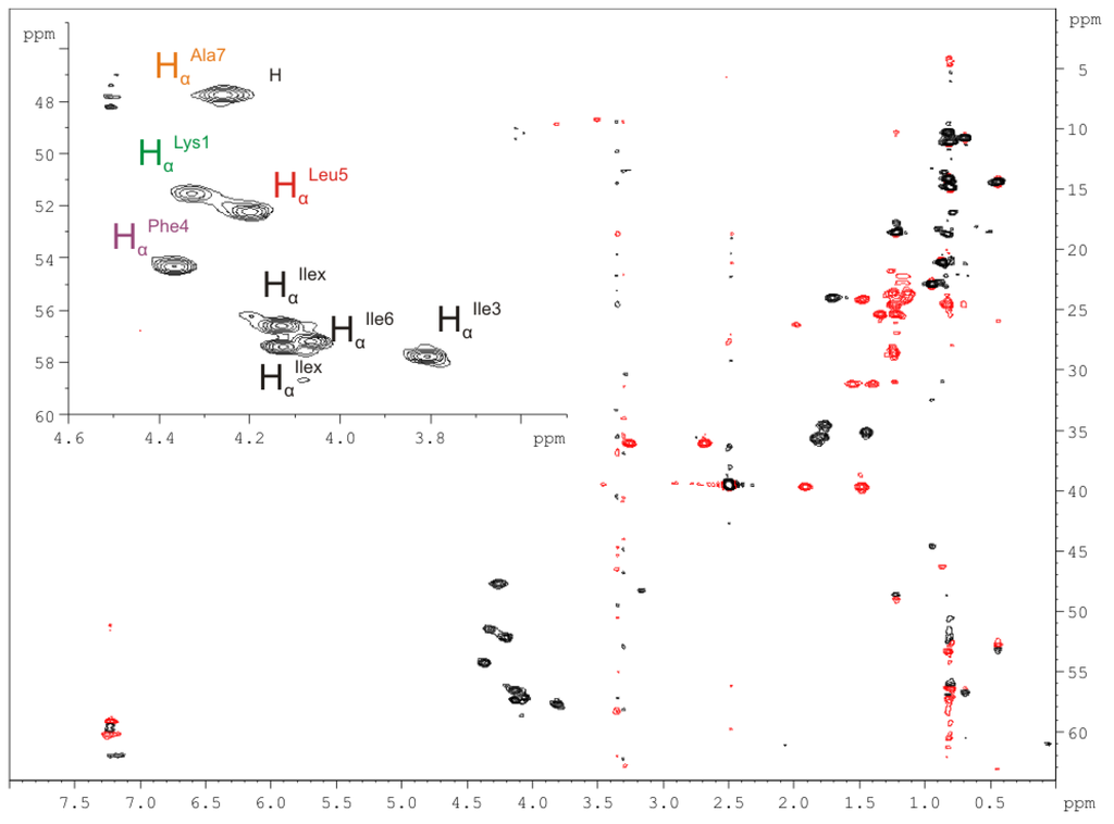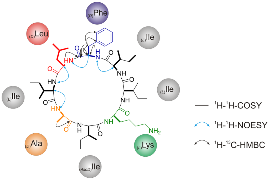 In the 1H-1H-COSY spectrum (Supplementary Figure S9) the (D)Ala7 Hα proton (4.28 ppm) shows a correlation to the Hβ/β′/β″ protons of the CH3 group (1.25 ppm), while three Hα protons, (L)Lys1 (4.34 ppm), (D)Phe4 (4.33 ppm), (D)Leu5 (4.22 ppm), show correlations to the Hβ/β′ protons of their corresponding CH2-groups (Hβ/β′(L)Lys1 (1.55/1.40 ppm), Hβ/β′(D)Phe4 (3.29/2.70 ppm), Hβ/β′(D)Leu5 (1.93/1.49 ppm)). The remaining four Hα protons, (x)Ilex (4.15 ppm), (x)Ile3 (3.78 ppm), (x)Ile6 (4.05 ppm), and (x)Ilex (4.14 ppm) show correlations to the Hβ protons of their corresponding CH-groups (Hβ(x)Ilex (1.85 ppm), Hβ(x)Ile3 (1.47 ppm), Hβ(x)Ile6 (1.82 ppm), Hβ(x)Ilex (1.85 ppm)).