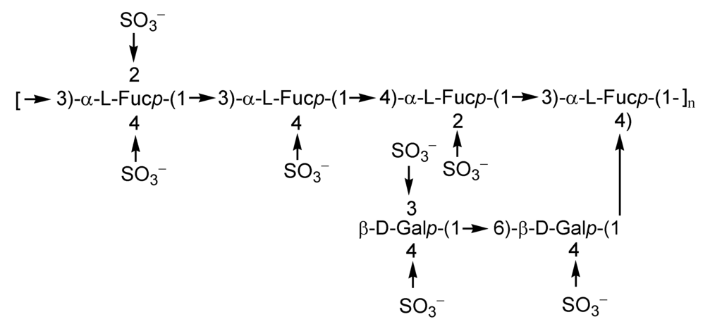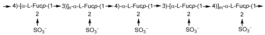 Fucoidans can be roughly divided into structural types as follows: α-l-fucans, galactofucans, fucomannouronans and other intermediate structures [11]. Fucoidans isolated from many edible brown algae contain mainly sulfated l-fucose residues attached to each other by α-1,3- or interchangeable α-1,3- and α-1,4-bonds. The regular structures may be masked by random acetylation and sulfation. Some fucoidans have branched structures. As a rule, fucoidans from different algal species differ from each other and vary not only in positions and level of sulfation and molecular mass, but sometimes in the structures of the main carbohydrate chains [12,13]. For example, the fucoidan from the brown alga Saccharina (=Laminaria) cichorioides is 2,4-disulfated 1,3-α-l-fucan (Figure 1), while the fucoidan from Fucus evanescens (Figure 2) contains blocks of α-1,3-fucooligosaccharides and α-1,4-fucooligosaccharides sulfated at the position 2 in fucose residues [14,15,16,17].