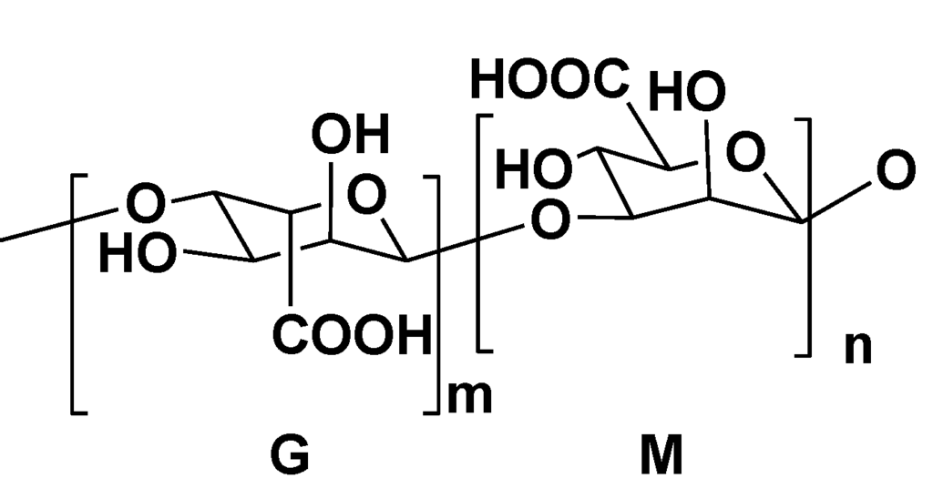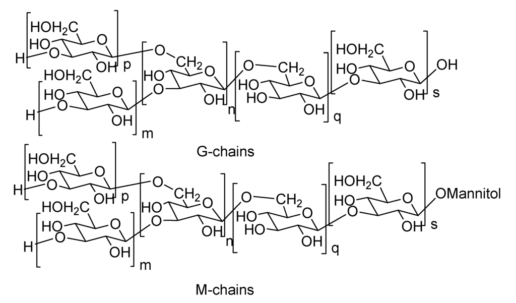 Alginic acids are widely distributed in the cell walls of brown seaweeds. These anionic polysaccharides were proved to be linear polymers containing blocks of 1,4-linked β-d-polymannouronate and α-l-polyguluronate (so-called M- and G-blocks) (Figure 5). Molecular masses of alginic acids ranged between 10 kDa and 600 kDa. These polysaccharides are used in the pharmaceutical industry and in biotechnology, particularly for cell immobilization and encapsulation.