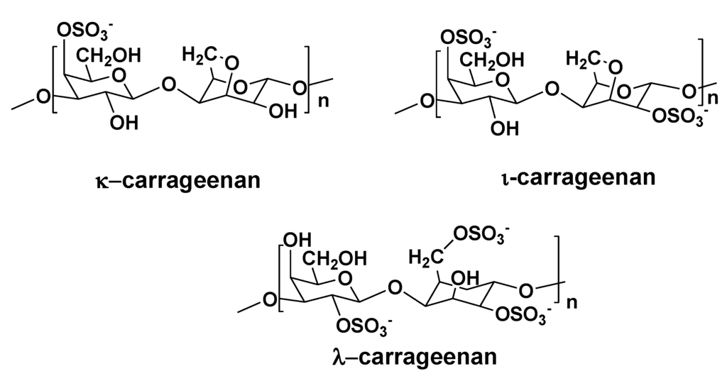 All carrageenans consist of either galactose or galactose and 3,6-anhydrogalactose monosaccharide units and differ from each other in monosaccharide composition, level of sulfation, positions of sulfate groups and molecular weights. Three groups of carrageenans, so-called kappa-, iota- and lambda-carrageenans, are of commercial significance (Figure 6). Hybrid forms of carrageenans are also known.