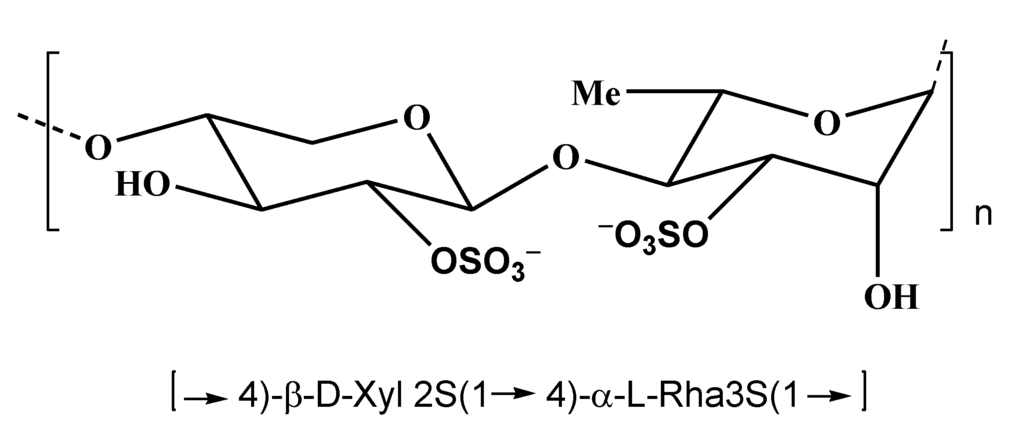 Among marine macrophytes, marine green algae have been less studied in comparison to brown and red algae as sources of polysaccharides with anticancer and cancer preventive properties. However, their antitumor properties have been sometimes reported, mainly for the polysaccharides belonging to the so-called ulvans. Ulvans, water soluble sulfated polysaccharides from the cell walls of green algae are characteristic of the plants, belonging to the genera Ulva, Enteromorpha, Monostroma, Caulerpa, Codium, and some others. They are composed of repeating disaccharide moieties, containing sulfated rhamnose and uronic acid (glucuronic or iduronic). The structure of the disaccharide moieties of ulvans resembles that of glycosaminoglycans, which occur in the extracellular matrix of connective tissues of animals. Some ulvans include also xylose residues (Figure 7) [103].