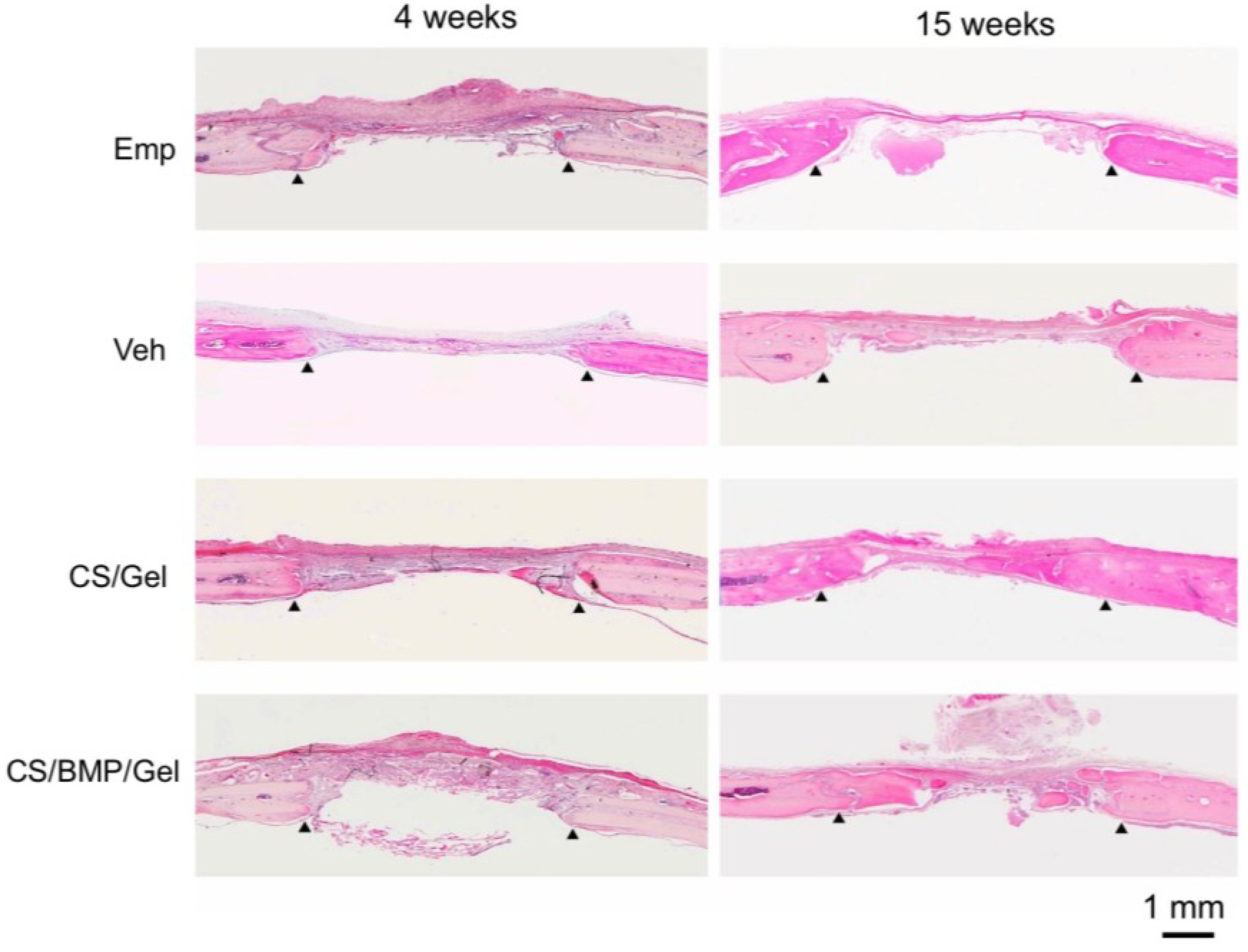 HE staining revealed that bone-like tissues had slightly covered the cut surface of the calvaria in all 4 groups at 4 weeks. At 15 weeks, bone formation was enhanced in the sqCS treated groups (CS/Gel and CS/BMP/Gel) compared to that in the empty defect (Emp) and vehicle (Veh: Sponge only) groups. Arrowheads indicate edges of host bone.