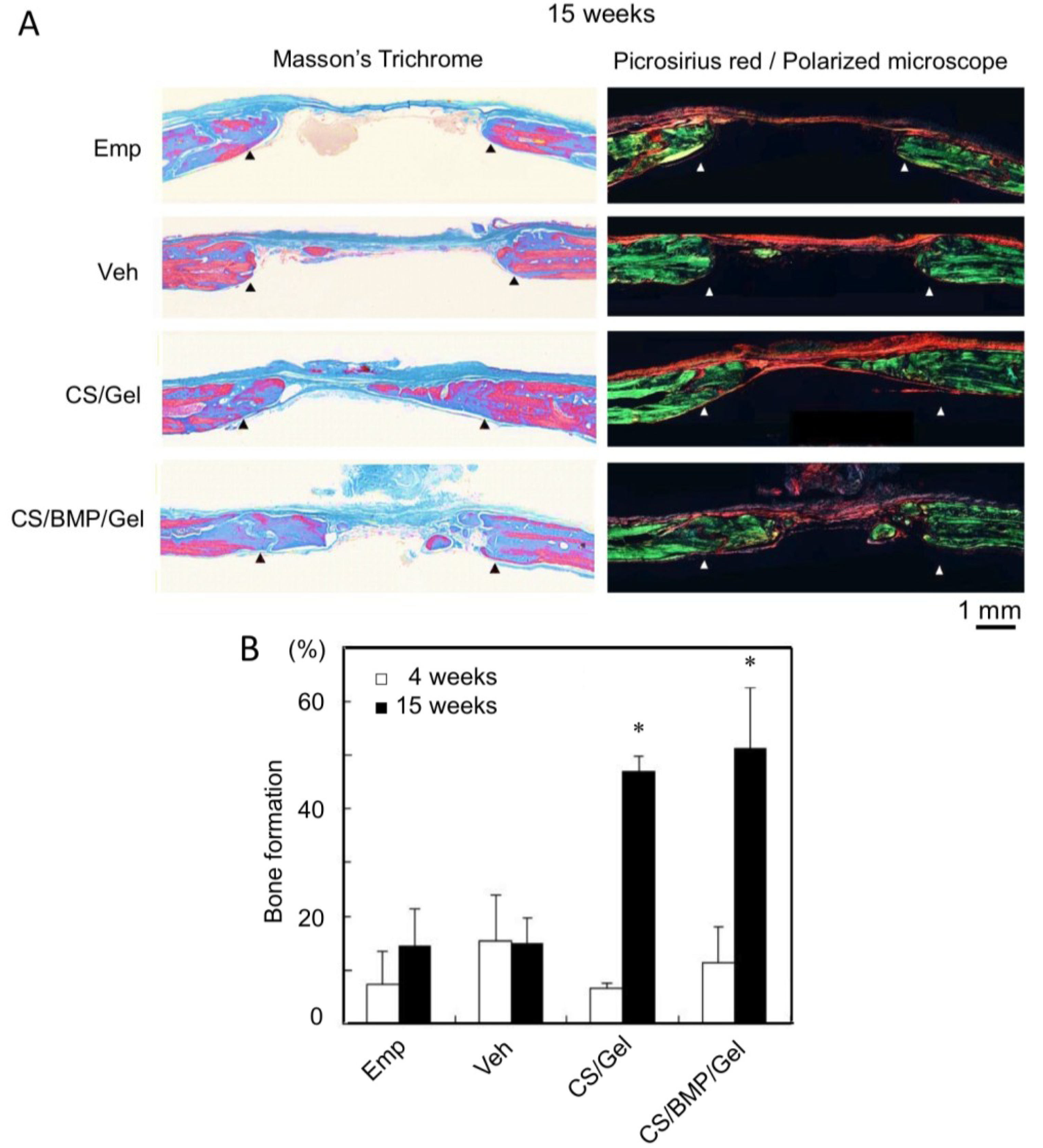 Bone-specific staining of sqCS-treated sponges showed marked bone repair at 15 weeks. (A) Masson’s Trichrome (blue: Mineralized-bone, red: Non-mineralized bone) and Picrosirius red/polarized microscopic observation. Arrowheads indicate edges of host bone; (B) Percentage of bone formation (%) was determined by image analysis from longitudinal Masson’s Trichrome sections. Significant values are represented as * P < 0.05 indicating significant difference from time-matched empty defects.