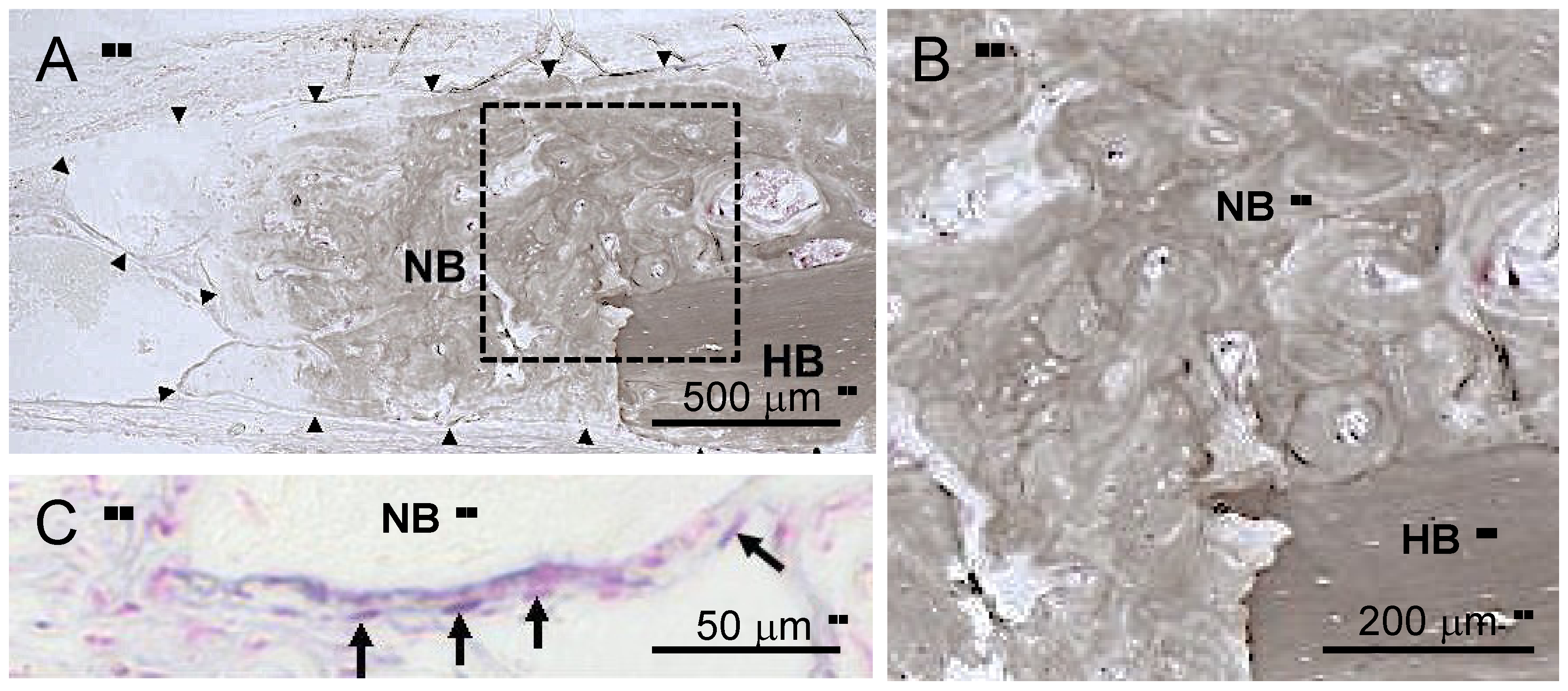 Von Kossa (calcium phosphate-specific staining)-ALP (osteoblast marker) stain of CS/Gel at 15 weeks in undecalfied sections (dark brown: Bone, purple: Osteoblast, pink: Nucleus). (A) Level of von Kossa staining of the new bone (NB) was less than that of host bone (HB) and slight mineral apposition was observed at the distal end of the new bone; (B) The Harversian system (osteon)-like structure was observed in the NB area; (C) ALP-positive cells were observed surrounding the distal end of new bone. Arrowheads surrounding the NB area (A) and arrows indicate ALP-positive cells, osteoblasts (C). B is an enlarged view of the dashed line-square in A.