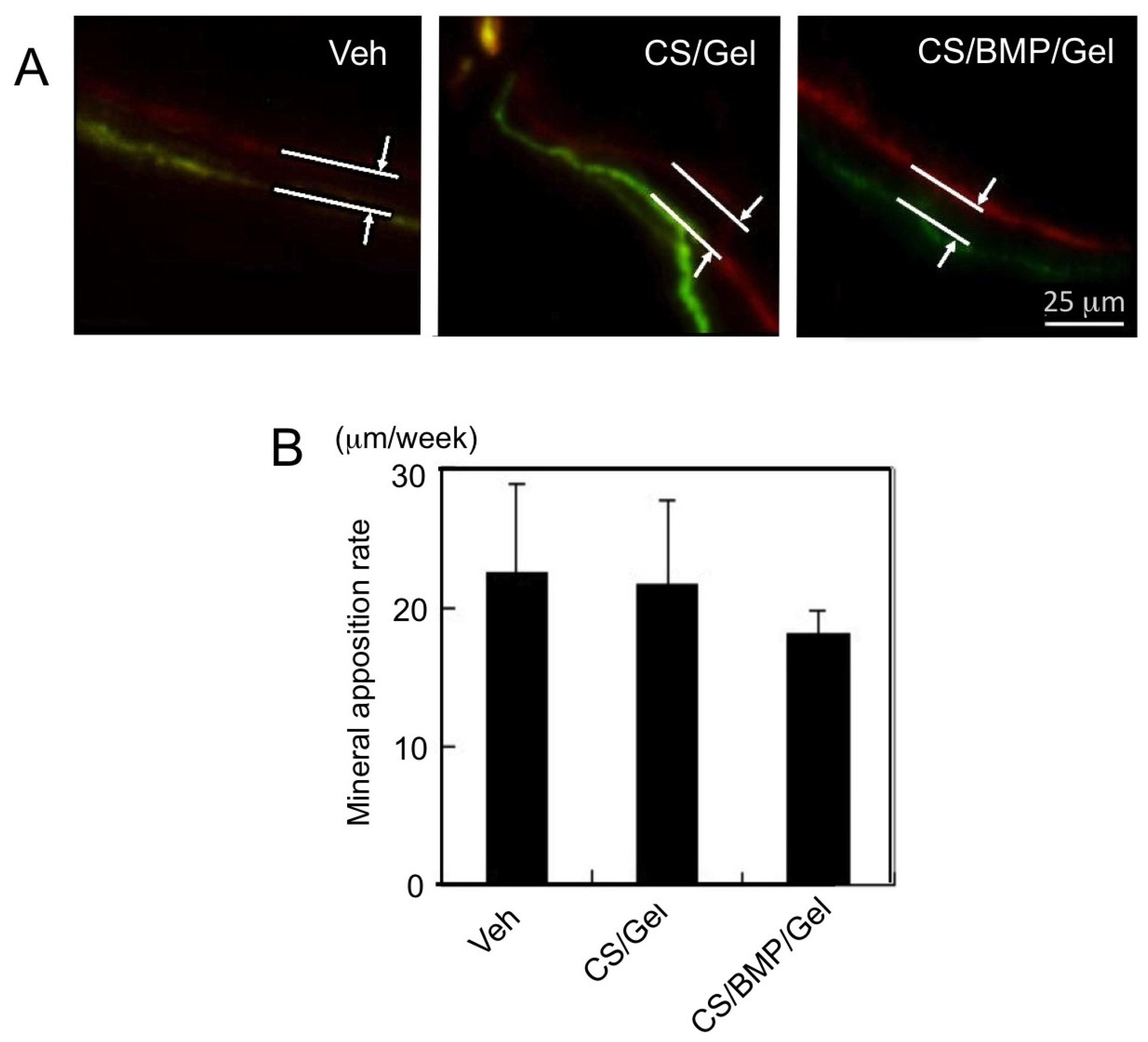 In order to evaluate the mineral apposition rate, fluorochrome labels were administered to rats at intervals of 6 to 5 weeks prior to euthanasia at 15 weeks (at 9 and 10 weeks post surgery). Clear double labels of calcein and alizarin red S can be seen in Figure 4A, indicating bone formation at 15 weeks post surgery. However, at the time points the rate of mineral apposition was equivalent in all groups B). During the measurement, it was noted that fluorochrome labels were observed at a site closer to the periphery of new bone, in the vehicle, CS/Gel and CS/BMP/Gel groups (not shown).