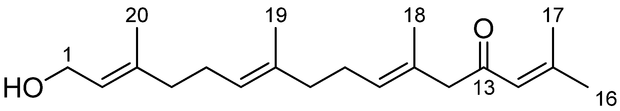 - Culioli, G.; Daoudi, M.; Ortalo-Magne, A.; Valls, R.; Piovetti, L. (S)-12-Hydroxygeranyl geraniol-derived diterpenes from the brown alga Bifurcaria bifurcate. Phytochemistry 2001, 57, 529–535. [Google Scholar]