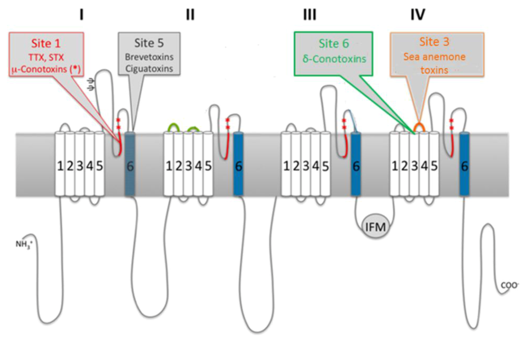 Sodium channel architecture and binding sites of marine neurotoxins. Cylinders represent transmembrane helices that comprise the four homologous domains. Sites targeted by marine neurotoxins are indicated by gray call-outs. Modified from [27].