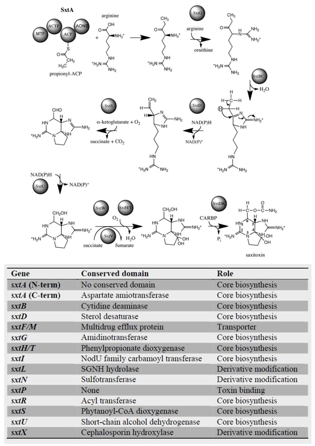 Saxitoxin genes identified in dinoflagellates. Saxitoxin biosynthesis pathway and genes involved based on studies in cyanobacteria [37]. Dinoflagellate genes identified to date are listed below the figure and are cumulative results of high-throughput sequencing experiments.