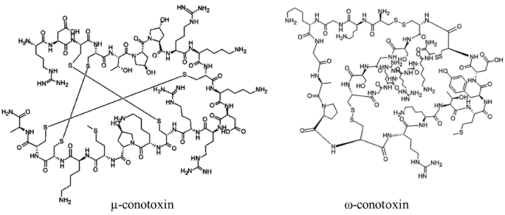 | Polypeptide | 12000–30000, n/a | Cone snails | N/A | Na channel sites 1 (μ) and 6 (δ); Ca channel (ω); nicotinic acetylcholine receptors (α) | Pore blocker (μ); prolonged channel opening (δ) |