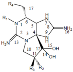 Molecular structure of saxitoxin and derivatives produced by marine dinoflagellates [1].
