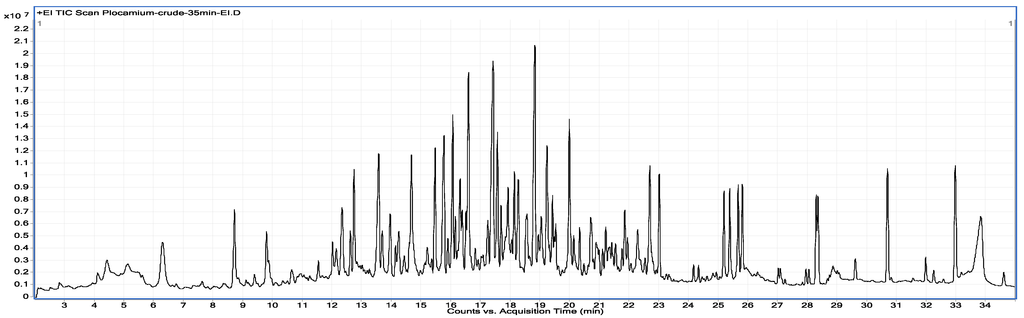 Electron impact (EIMS) total ion chromatogram (TIC) from a 35 min temperature gradient (60 °C to 300 °C) of a Plocamium cartilagineum lipophilic extract (3:1 dichloromethane/methanol). More than 50 resolved peaks are evident, most of which display halogen isotopic distribution patterns indicative of the polyhalogenated monoterpenes that P. cartilagineum is known to produce [].