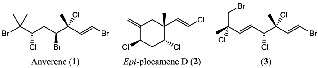 Mixed population algae from the 2010 collection were thawed, then extracted in 3:1 dichloromethane/methanol. The concentrated lipophilic extract was examined by GC/MSm as described below, then purified by repeated medium pressure silica gel chromatography (100% hexane to 100% ethyl acetate on 4 g or 12 g Teledyne/Isco silica gel cartridges)m followed by repeated high pressure liquid chromatography (10 × 250 mm Sunfire column, 5 mL/min 100% pentane). Anverene (1), epi-plocamene D (2), and (1E,3R,4R,5E,7S)-1,8-dibromo-3,4,7-trichloro-3,7-dimethylocta-1,5-diene (3) were characterized by comparison of their 1H and 13C NMR spectra to that reported in the literature [,]. Compounds 1 and 3 were also subject to X-ray crystallographic analysis.