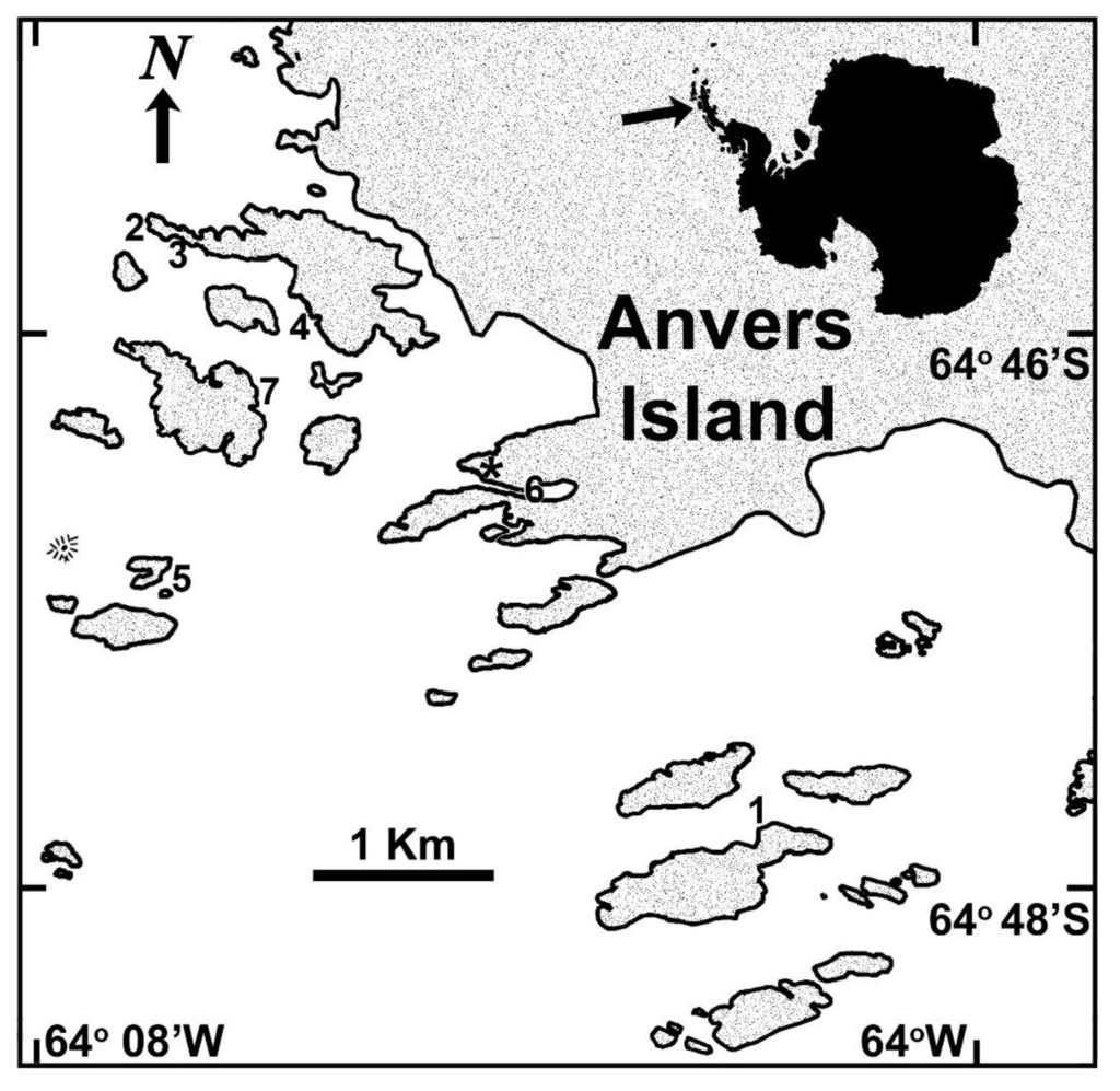 Collecting sites within the small boating range of Palmer Station, Antarctica (designated with an asterisk). (1) Hermit Island, algae collected at 19 m; (2) Norsel Point wall, 10 m; (3) Norsel Point cove, 6 m; (4) Old Palmer Station, 4 m; (5) Bahia Paraiso shipwreck, 17 m; (6) Hero Inlet, 6 m; (7) Litchfield Island, 12 m. The silhouette and arrow in the upper right indicate the location of Anvers Island along the Antarctic continent.